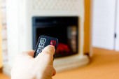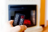 Elektryczny kominek zdalne sterowanie w ludzkiej ręce.