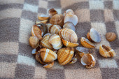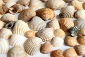 Małże Wenus, kolczaste kąkol muszle, muszle Abstrakcja ilustracja kolory tła, brązowy i biały, jeden po drugim