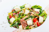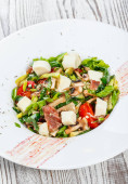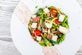 Sałatką ze świeżych warzyw z prosciutto, szpinak, pieczarki, pomidory, ser, cebula, ogórki i awokado na tabliczce na jasnym tle drewnianych. Zdrowe jedzenie. Widok z góry