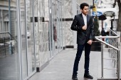 Zdjęcie "Młody człowiek indian na czarny garnitur i krawat stwarzane odkryty." może być wykorzystywane do celów osobistych i komercyjnych zgodnie z warunkami zakupionej licencji Royalty-free. Obraz jest dostępny do pobrania w jakości wysokiej rozdzielczości do 5760x3840.