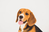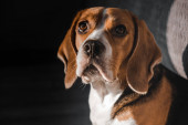 młody szczeniak, pies rasy beagle, na białym na czarnym tle.