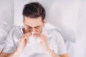 Dziewczyna dmuchanie nosa w tkanek twarzy, siedząc z kotem na kanapie