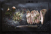 Zdjęcie "Pieczone plasterki szynki Boże Narodzenie Turcja na ciemnym tle rustykalnym. Widok z góry. Festiwal jedzenia." może być wykorzystywane do celów osobistych i komercyjnych zgodnie z warunkami zakupionej licencji Royalty-free. Obraz jest dostępny do pobrania w jakości wysokiej rozdzielczości do 5760x3840.