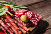 zbliżenie deski do krojenia drewniana z pyszne wędzone wędliny, warzywa i plasterki salami