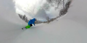 Selfie: Fajne snowboardzista rzeźbi świeżego puchu i omija drzewa na ośnieżonych górskich. Ekstremalnych człowiek jeździ jego snowboard off piste i przez niebezpieczny Las na doskonałe słoneczny zimowy dzień