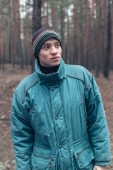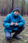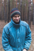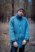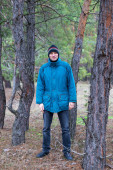 Portret młodego mężczyzny tłuszcz w sosnowym lesie.