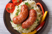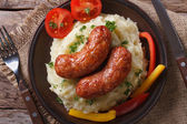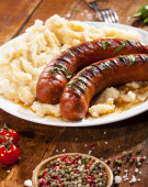 Grillowane kiełbaski i tłuczone ziemniaki na białym talerzu i drewnianym tle
