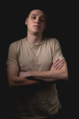 Młody facet z karnego wygląd w czarną skórzaną kurtkę stoi w pobliżu Starego van biały