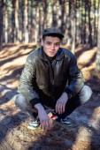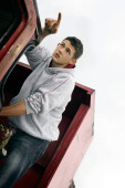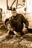 Młody facet z karnego wygląd w czarną skórzaną kurtkę stoi w pobliżu Starego van biały.