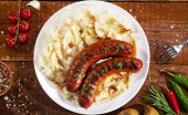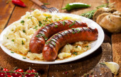 Kiełbaski z grilla z warzywami i przyprawami na białym talerzu i drewniane tła
