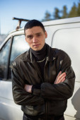Młody facet z karnego wygląd w czarną skórzaną kurtkę stoi w pobliżu Starego van biały.