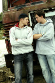 Zdjęcie "Młody facet z karnego wygląd w czarną skórzaną kurtkę stoi w pobliżu Starego van biały." może być wykorzystywane do celów osobistych i komercyjnych zgodnie z warunkami zakupionej licencji Royalty-free. Obraz jest dostępny do pobrania w jakości wysokiej rozdzielczości do 5760x3840.