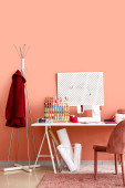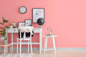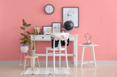 Wnętrze pokoju z wygodnymi fotelami w pobliżu różowe ściany
