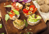 Zdjęcie "Zbliżenie z różnych mini Kanapki na deska do krojenia i drewnianym stołem." może być wykorzystywane do celów osobistych i komercyjnych zgodnie z warunkami zakupionej licencji Royalty-free. Obraz jest dostępny do pobrania w jakości wysokiej rozdzielczości do 5760x3840.