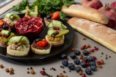 Zbliżenie z różnych mini Kanapki na deska do krojenia i drewnianym stołem.
