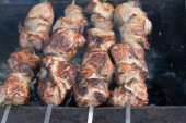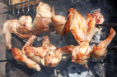 Zdjęcie "Gotowanie na ramie metalowej grill grilla kebab. Pieczone mięso gotowane na grill z dymu. Bliska Bbq świeży kurczak mięso plastry. Tradycyjne danie Wschodniej. Grill na węgiel drzewny i płomień, piknik, Sprzedawcy uliczni. Stonowana, styl, klasyczne zdjęcie." może być wykorzystywane do celów osobistych i komercyjnych zgodnie z warunkami zakupionej licencji Royalty-free. Obraz jest dostępny do pobrania w jakości wysokiej rozdzielczości do 5760x3840.