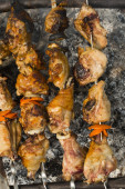 Gotowanie na ramie metalowej grill grilla kebab. Pieczone mięso gotowane na grill z dymu. Bliska Bbq świeży kurczak mięso plastry. Tradycyjne danie Wschodniej. Grill na węgiel drzewny i płomień, piknik, Sprzedawcy uliczni. Stonowana, styl, klasyczne zdjęcie.