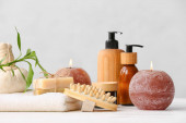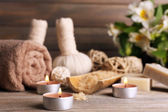 Kompozycja Piękne spa z płonących świec i mydła barów na drewnianym stole