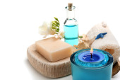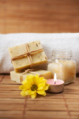 Kompozycja Piękne spa z płonących świec i mydła barów na drewnianym stole