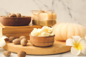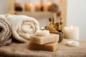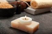 Kompozycja Piękne spa z płonących świec i mydła barów na drewnianym stole