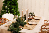 Prezenty i pudełka pod choinką. Beżowe pudełka ze wstążką. Nowy rok urządzone wnętrze domu. Koncepcja Winter Holiday