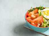Poke Hawajska Sałatka z łososia, awokado, szpinaku i warzywa w płycie na stół biały