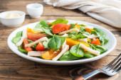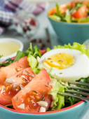 Poke Hawajska Sałatka z łososia, awokado, szpinaku i warzywa w płycie na stół biały