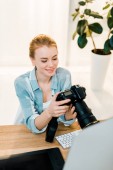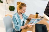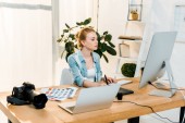 piękny koncentruje się młodych retusz zdjęć za pomocą tabletu w biurze