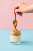 Zbliżenie z dulce de leche Karmel w puszce cyny. Biały kamień
