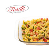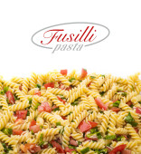 Wegetariańskie wegetatywnego makaron Fusilli z pomidorami, zieloną cebulką, roztrzepane jajka i tartym serem. Przygotowanie potraw do pieczenia w piecach