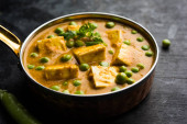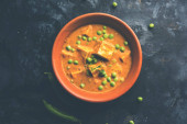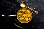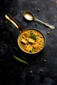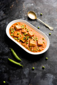 Zielony groszek lub matar paneer curry przepis, serwowane w misce. Selektywny fokus