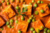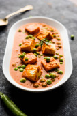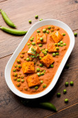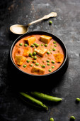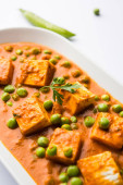 Zielony groszek lub matar paneer curry przepis, serwowane w misce. Selektywny fokus