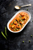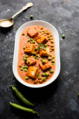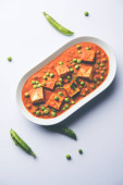 Zielony groszek lub matar paneer curry przepis, serwowane w misce. Selektywny fokus