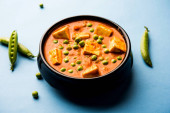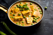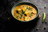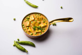 Zielony groszek lub matar paneer curry przepis, serwowane w misce. Selektywny fokus