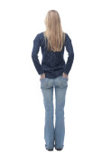 Widok stoi młody piękny blond kobiety w sweter z tyłu