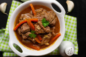 Jedzenie koncepcja domu mięso pikantny gulasz z patelni żeliwna patelni z miejsca kopii