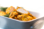 Kalafior zapiekany z klopsiki w sosie serowym, w ceramicznej formie na drewnianym stole.