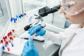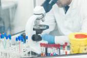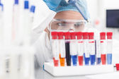 Próbki krwi i lekarz biorąc probówki z nim z bliska