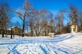 Zdjęcie "Dawn mroźny poranek. Pejzaż zimowy, mroźny drzew, biały śnieg i niebieskie niebo. Spokojny zimowej przyrody w słońcu w parku" może być wykorzystywane do celów osobistych i komercyjnych zgodnie z warunkami zakupionej licencji Royalty-free. Obraz jest dostępny do pobrania w jakości wysokiej rozdzielczości do 5760x3840.