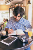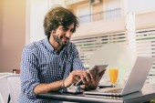 Młody przystojny mężczyzna w kawiarni, trzymając tablet i pracuje w trybie online z laptopem, picia sok pomarańczowy, spokojny i pewny siebie.