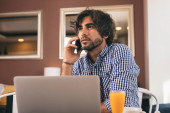 Zdjęcie "Młody przystojny mężczyzna w kawiarni, trzymając tablet i pracuje w trybie online z laptopem, picia sok pomarańczowy, spokojny i pewny siebie." może być wykorzystywane do celów osobistych i komercyjnych zgodnie z warunkami zakupionej licencji Royalty-free. Obraz jest dostępny do pobrania w jakości wysokiej rozdzielczości do 5760x3840.