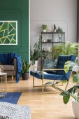 Jasny pokój dzienny wnętrza, wygodne kanapy, Złote światło i zielonych roślin w dużym garnku biały