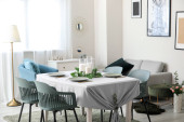 Zdjęcie "Dwa krzesła, okrągłym stole pośród współczesnej otwarta kuchnia na śniadanie" może być wykorzystywane do celów osobistych i komercyjnych zgodnie z warunkami zakupionej licencji Royalty-free. Obraz jest dostępny do pobrania w jakości wysokiej rozdzielczości do 5760x3840.
