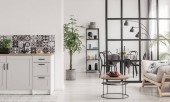 Dwa krzesła, okrągłym stole pośród współczesnej otwarta kuchnia na śniadanie