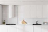 Zdjęcie "Wnętrze nowoczesna kuchnia z białe ściany wyłożone kafelkami, biały i drewniane blaty z wybudowania urządzeń i białe szafki. renderowania 3D" może być wykorzystywane do celów osobistych i komercyjnych zgodnie z warunkami zakupionej licencji Royalty-free. Obraz jest dostępny do pobrania w jakości wysokiej rozdzielczości do 5760x3840.