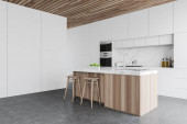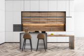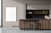 Zdjęcie "Wnętrze nowoczesna kuchnia, szare i czarne ściany z cegły, blaty szary, szary i drewniane szafy i drewniany stół z krzesłami. renderowania 3D" może być wykorzystywane do celów osobistych i komercyjnych zgodnie z warunkami zakupionej licencji Royalty-free. Obraz jest dostępny do pobrania w jakości wysokiej rozdzielczości do 5760x3840.