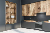 Wnętrze nowoczesna kuchnia, szare i czarne ściany z cegły, blaty szary, szary i drewniane szafy i drewniany stół z krzesłami. renderowania 3D