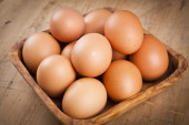 jaja w bascket na drewnianym stole