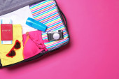 Zdjęcie "Widok góry torba podróżna pakowane z klapki i kamery" może być wykorzystywane do celów osobistych i komercyjnych zgodnie z warunkami zakupionej licencji Royalty-free. Obraz jest dostępny do pobrania w jakości wysokiej rozdzielczości do 5760x3840.