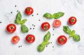 Ekologiczne pomidory Sugardrop na winorośli z bazylią i pieprz na desce do krojenia na tle kamień.